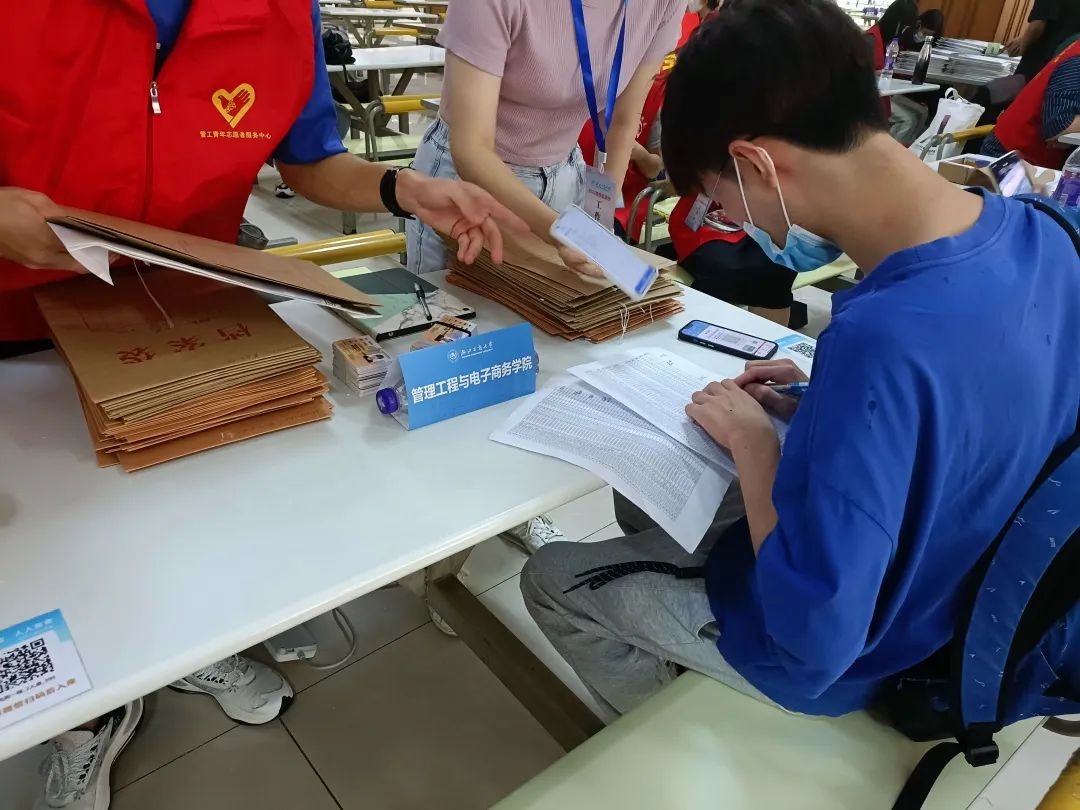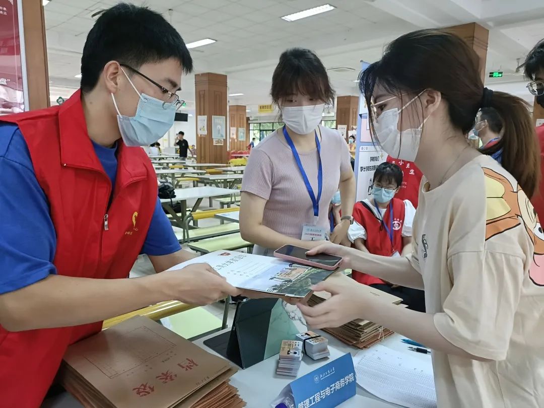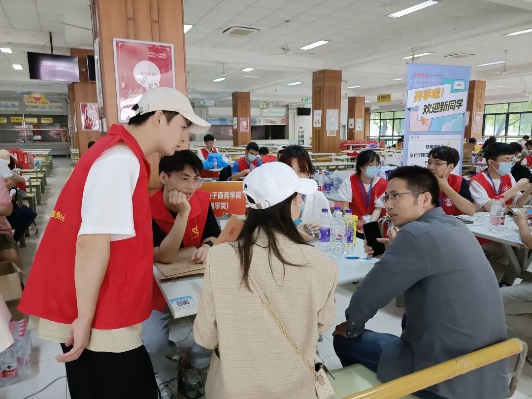 报到现场热闹忙碌,迎新各项工作在井然有序地进行。迎新志愿者们细心审核入学材料,耐心答疑解惑,为新生们贴心办理好每项入学手续。