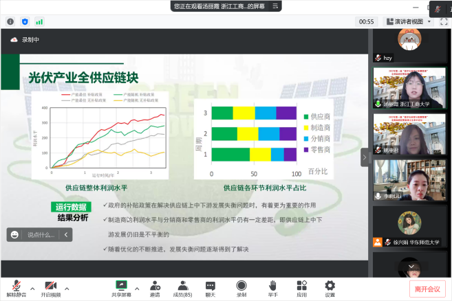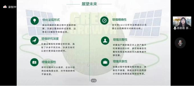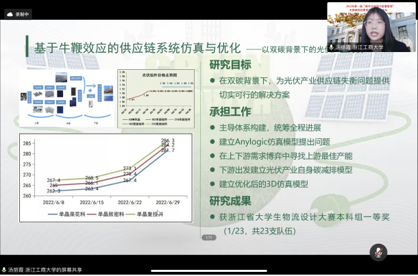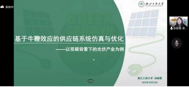 此次论坛聚焦企业数字经济、数字化转型与商业模式创新、供应链数字化转型、智慧能源数字化转型、数字化技术、数字化与智慧医疗等方向的现实问题进行了交流研讨。韩剧tv 学子物流1902班汤丽霞同学将其项目《基于牛鞭效应的供应链系统仿真与优化——以双碳背景下的光伏产业为例》在此次论坛上进行了交流汇报。