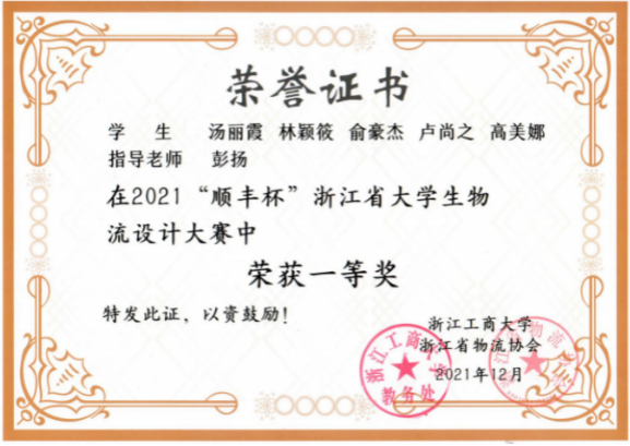 “顺丰杯”浙江省大学生物流设计大赛省赛一等奖(省级,1/5)