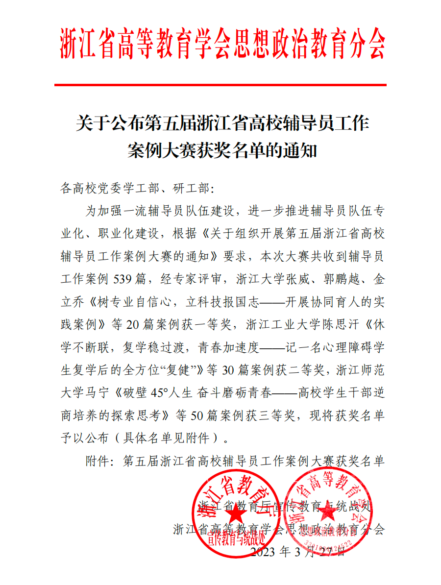 为深入学习党的二十大精神,全面贯彻习近平新时代中国特色社会主义思想,进一步落实《关于推进浙江省高校一流辅导员队伍建设的实施意见》,切实提升高校辅导员思想政治理论水平和素质能力,浙江省教育宣传教育处、浙江省高等学会思想政治教育研究分会组织开展了第五届浙江省高校辅导员工作案例大赛。围绕思想理论教育和价值引领、党团和班级建设、学业指导、学生日常事务管理、心理健康教育与咨询工作、网络思想政治教育、校园危机事件应对、职业规划与就业创业指导等工作职责内容递交工作案例作品。