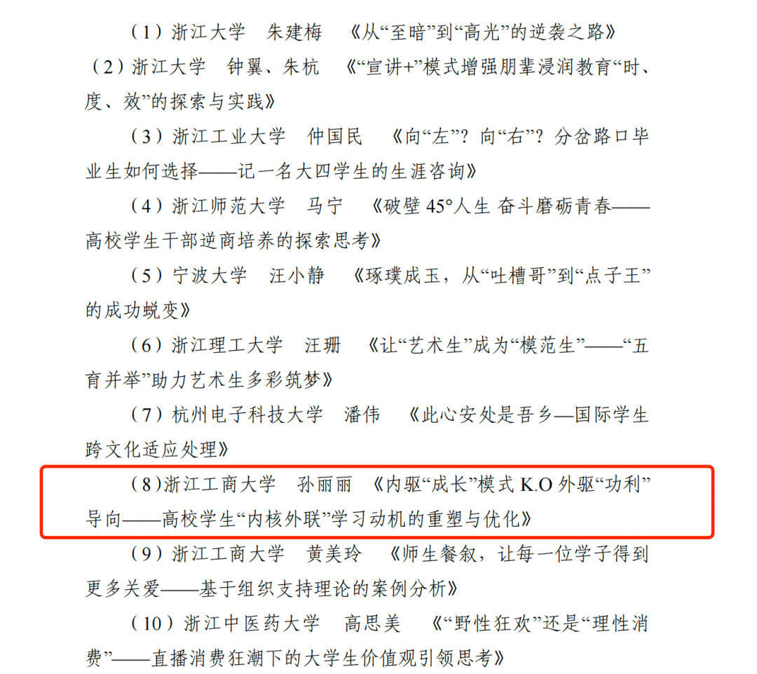 第五届浙江省高校辅导员工作案例大赛评选结果日前揭晓,韩剧tv 孙丽丽老师撰写的《内驱“成长”模式 K.O 外驱“功利” 导向——高校学生“内核外联”学习动机的重塑与优化》喜获浙江省三等奖