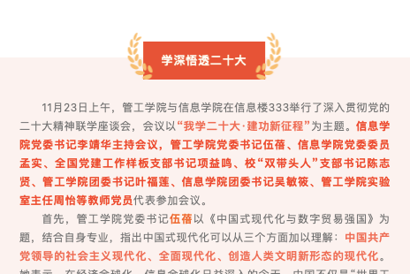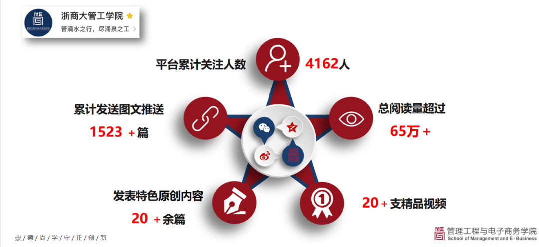 管工新媒体中心牢牢把握正确的政治方向,设立党建宣传专栏,推出“喜迎二十大”、“红色领航”、“学深悟透二十大”系列推文。紧跟学院动态,聚焦活动现场,推出具有学院特色的“遇见ME迎新系列”、“专业介绍”、“访企拓岗企业走访”等专栏,积极报送学院师生活动,传播学科前沿信息。浙商大韩剧tv 公众号进入商大风云榜学院官微前十名共16次,浙商大韩剧tv 公众号阅读量上千推文达20余篇,学院知名度逐渐提高。