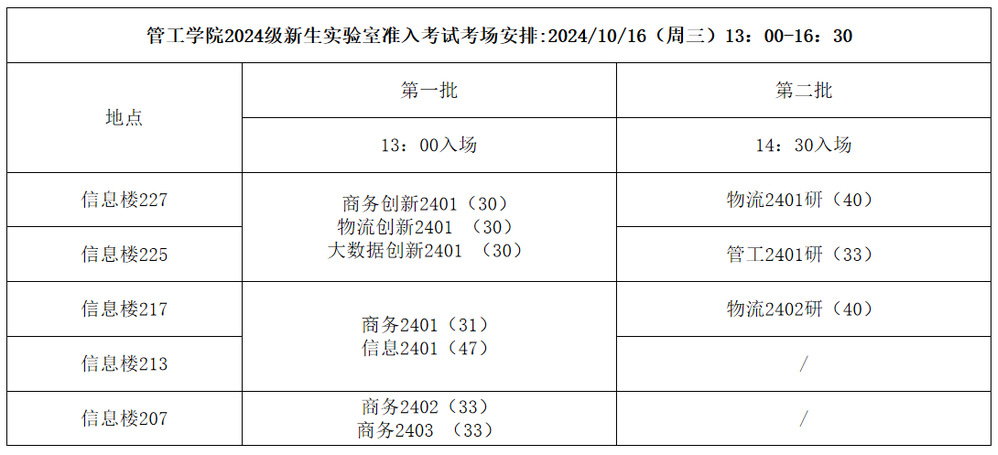 根据实验室安全工作部署,学院定于2024年10月16日(第5周周三)下午,在学院实验室进行2024级新生实验室准入考试。请各位同学认真学习《韩剧tv 实验室安全手册》,了解学校相关规章制度,也可通过统一身份认证登录“实验室安全考试系统”进行在线学习和模拟测试,平台地址://labexam.hanjuvip.net。请各位同学积极备考,按时到场参加考试。具体时间及场地安排如下: