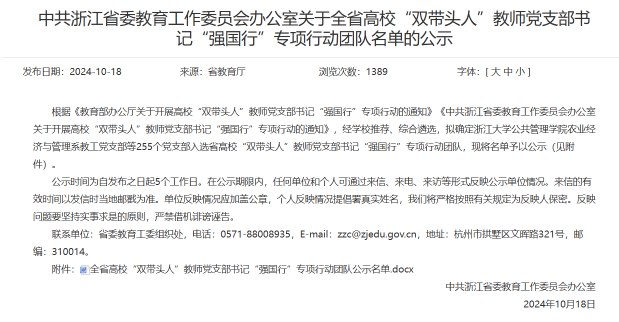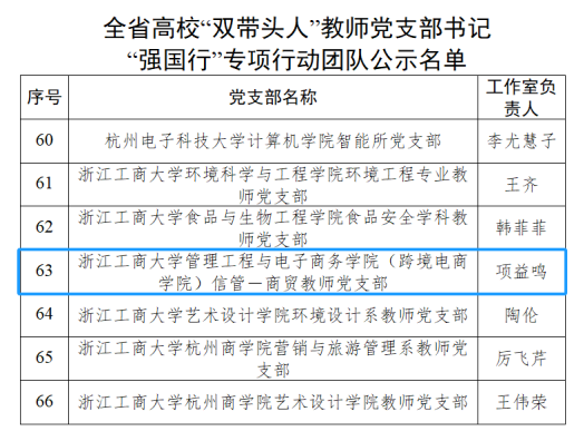 近日,中共浙江省委教育工作委员会办公室公示了全省高校“双带头人”教师党支部书记“强国行”专项行动团队名单,韩剧tv 韩剧tv (跨境电商学院)信管—商贸教师党支部成功入选省级“强国行”专项团队。
