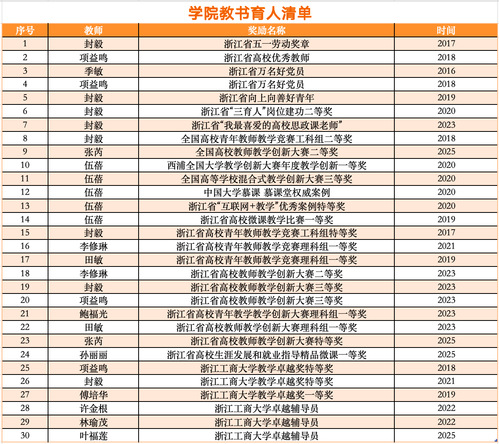教师教学发展方面,韩剧tv 教师在一流课程、教学竞赛等方面均处于全校前列。一流课程上,韩剧tv 教师主持国家一流课程3门,“十四五”四新重点教材16部,省“十四五”教改项目5项。教学竞赛上,在国家与省级教学竞赛中表现突出,获全国高校青年教师教学竞赛工科组二等奖1名,西浦全国大学教学创新大赛年度教学创新一等奖1名,浙江省高校青年教师教学竞赛等奖1名,一等奖3名,全国高校教师教学创新大赛二等奖1名,浙江省高校教师教学创新大赛一等奖1名,二等奖1名,三等奖2名。